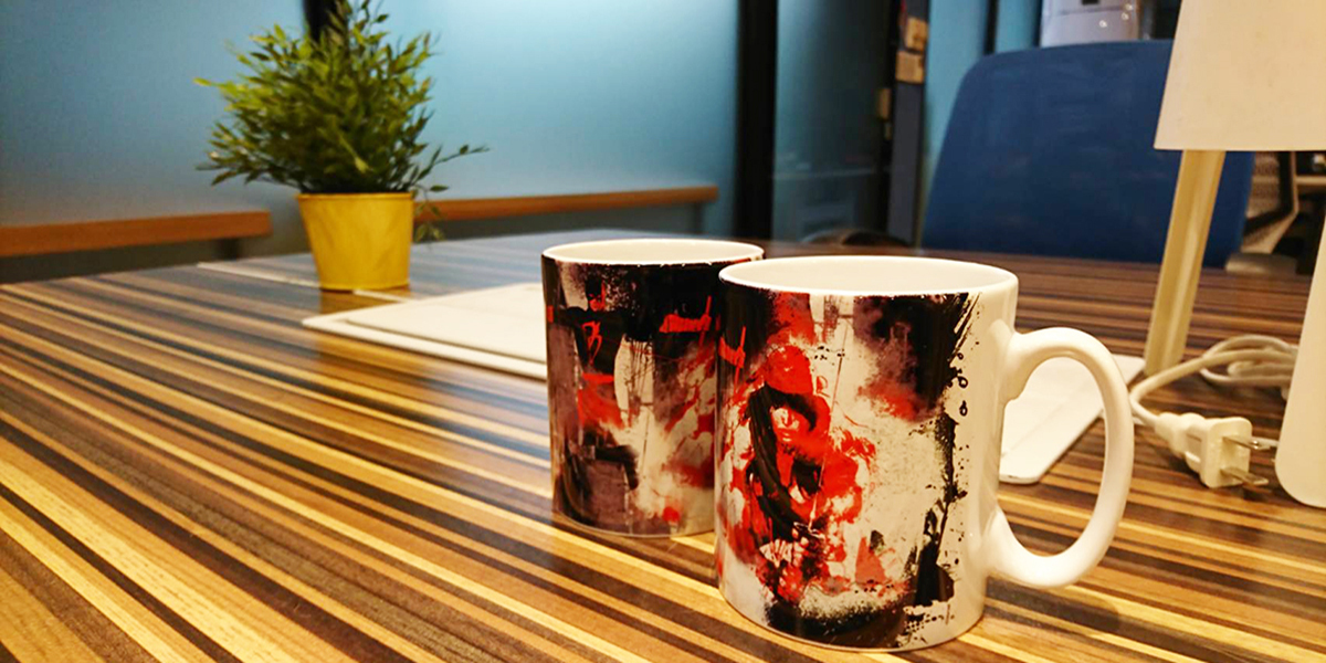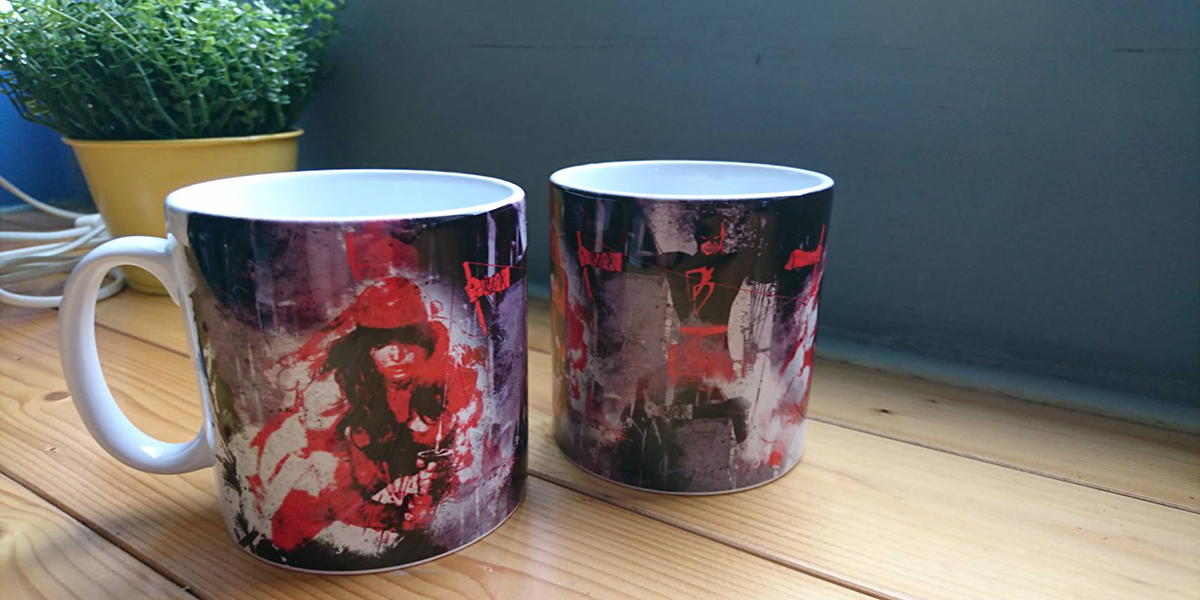 以漫威知名英雄男女檔-艾莉崔&夜魔俠為主題的素描繪圖風格馬克杯;呈現出受年輕族群青睞的後現代藝術潮流風格。